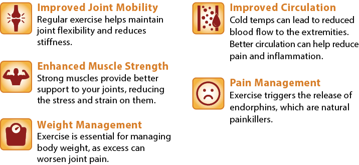 Don’t let the cold weather deter you from managing your arthritis pain through exercise. Regular, ongoing physical activity can lead to long-term improvements in joint function and reduced pain.